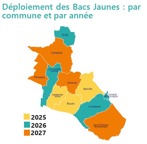 En 2025 les habitants de Bouée, Malville et Lavau-sur-Loire sont concernés par une dotation généralisée des bacs jaunes sur leur commune qui viendront remplacer les sacs jaunes. Les autres communes du territoire seront équipées en 2026 et 2027, et les habitants seront informés par courrier des modalités de retrait de leur bac.