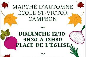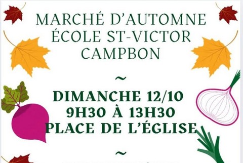 Le12oct. Du 09h30 à 13h30 Place de l'église Campbon Marché Marché d'automne - Ecole Saint-VictorOrganisé par l'école Saint-Victor de CampbonAjouter à mon calendrier Fermer PrécédentRetour à la listeSuivant