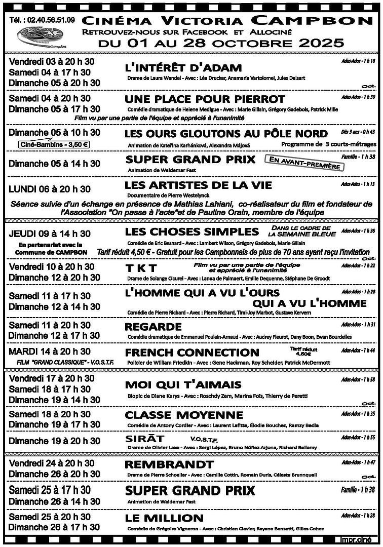 Cinéma Victoria Le Cinéma Victoria est un cinéma associatif crée en 1946, doté d’une salle d’une capacité de 300 places accessible aux personnes handicapées et équipé du son et image numériques dolby stéréo. Contact Cinéma Victoria 1, Rue Saint-Victor 44750 Campbon Tél. : 0240565109 Programme du 1er au 28 octobre 2025